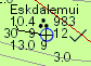 Observations for each station are plotted around its location as shown in the observation rose at right. The location is marked by a circle which contains a symbol for amount of cloud or "+" for an AWS not observing cloud. A wind shaft and feathers show the direction and speed of wind blowing into the station. The sample plot at right may help reading clockwise from the top. The station name is Eskdalemuir (only the first 10 letters are given), and the Weather symbol (3 dots) shows continuous moderate rain is falling. The barometer is 998.3 hPa, and the symbol showing barometer trend indicates it fell a bit then rose1.2 hPa in the past 3 hours. 3.0mm of rain has fallen in the past 12 hours, while in the past 24 hours the minimum temperature has been 9 and the rainfall 13.0mm. Currently, visibility is 30km, the dew point is 9 and the temperature 10.4. Learn more in the help section on synoptic plots.