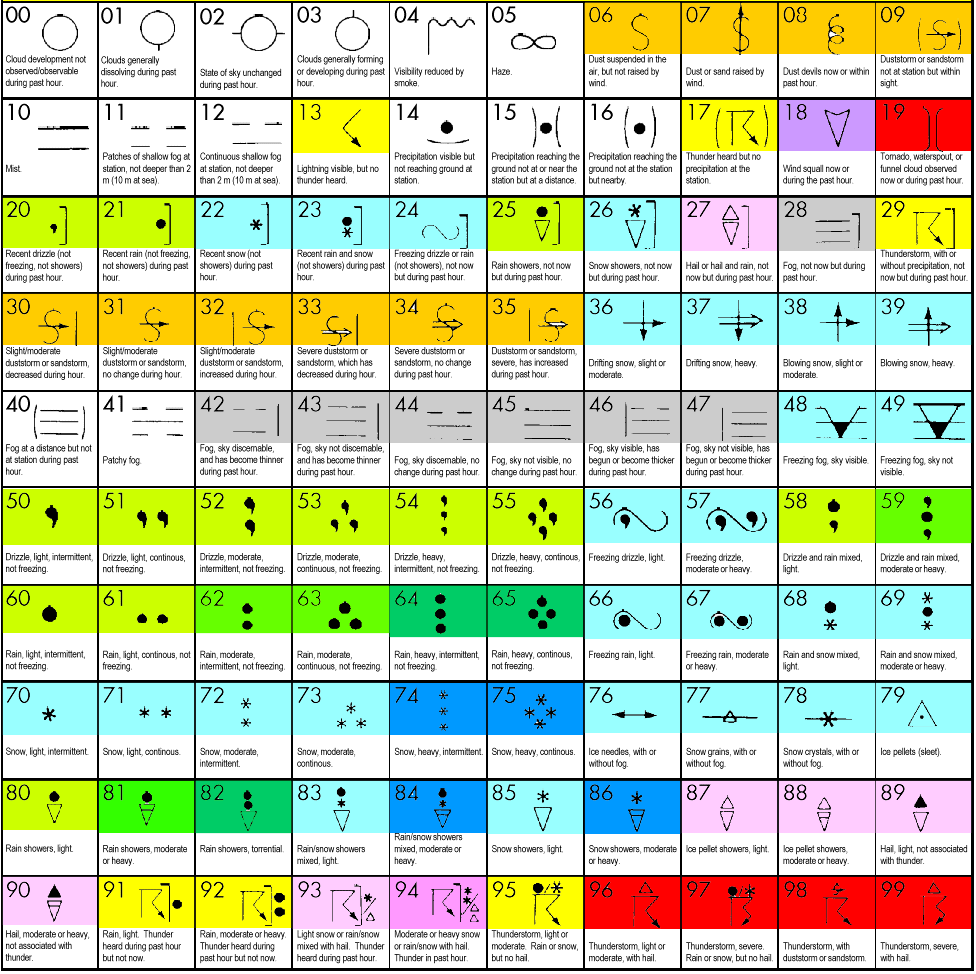 Print | Close | Weather symbols | Cloud and pressure trend symbols | Wind speed and direction symbols